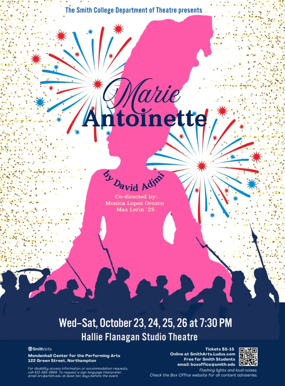 Northampton MA - The Smith College Department of Theater presents Marie Antoinette by David Adjmi on October 23, 24, 25, and 26 at 7:30 p.m. in Hallie Flanagan Studio Theatre co-directed by Monica Lopez Orozco and Max Lerin ’25. In this modern take on the life of the famous French queen, Marie is a symbol of aristocratic extravagance and artifice. But as revolution begins to brew in France, the political becomes deeply personal as the once popular Marie’s world comes tumbling down. With the light and breezy banter at the palace and the chants of “Liberté, Egalité, Fraternité!” in the streets, Marie Antoinette holds a mirror up to our contemporary society that might also be entertaining itself to death. Tickets are $5–15 at smitharts.ludus.com.