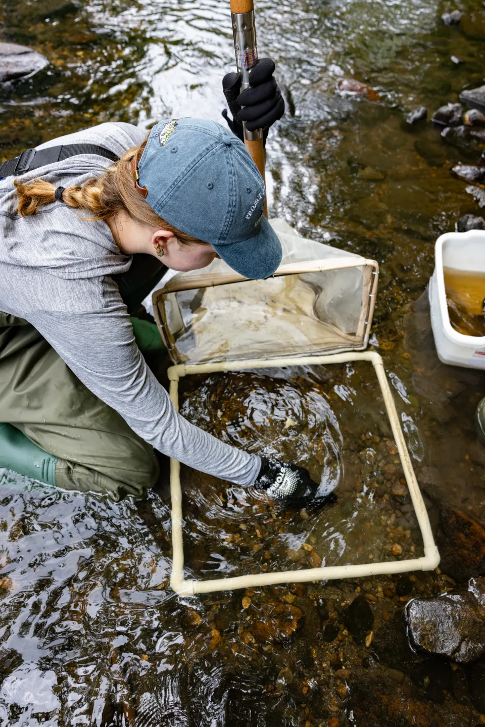Lilian Olson ’25, Lya Rao ’26, and Sabrina Wang ’27 are standing in the middle of the Mill River on a sunny summer day, staring into the burbling current. “There’s lots of leaf litter over here,” says Olsen, hefting a stone. As the other two poke and scrape, Wang, in large green waders, settles onto a large rock and arranges an open net at her feet.