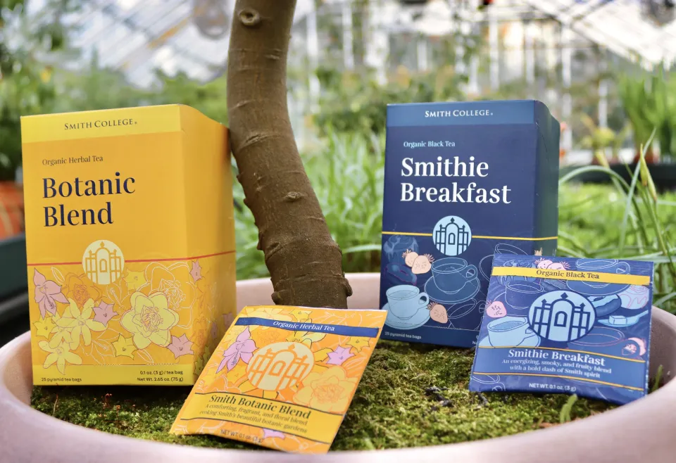 Smithie Breakfast Organic Black Tea and Botanic Blend Organic Herbal Tea are now available in person at the Smith bookstore at 8 Green St., at the Campus Center Café, and online.