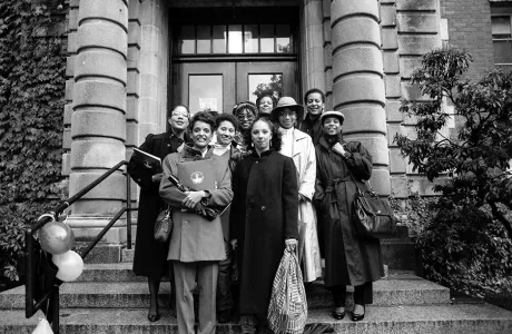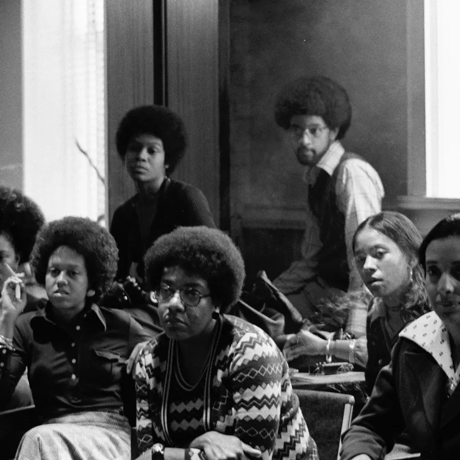 Attending a Black Students’ Alliance board meeting at the Mwangi Cultural Center are, from left, front row: Patricia Samuels Blanchard ’74, Patricia McCalla Harden ’73, M.S.W. ’82, Portia Gordon ’74, Sylvia (Cookie) Smith Lewis ’74, and an unidentified student; back row: Linda Smith Charles ’74 and William Boulware (Wesleyan ’71).