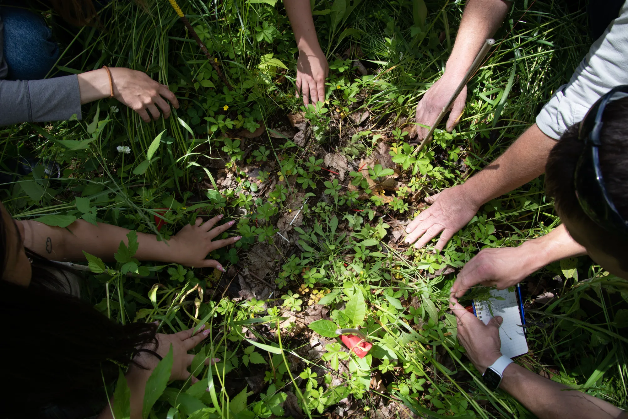 Students at MacLeish Field Station look after recently established research plots with toothpicks marking the locations of magnolia seeds. Photograph by Adam Detour