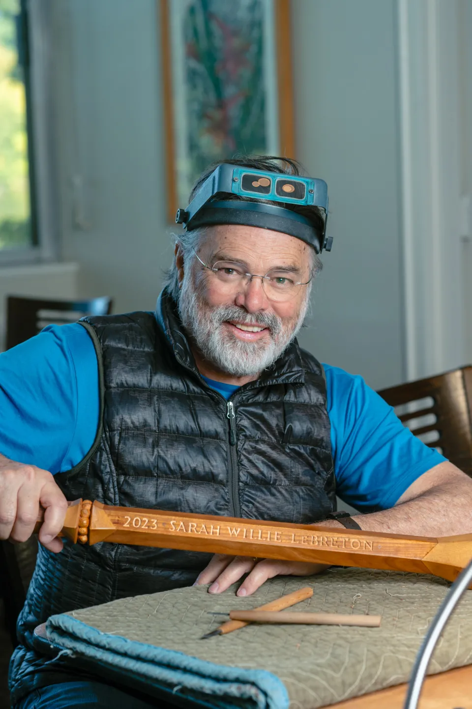 Stinehour performed the exacting letterwork of adding “2023 Sarah Willie-LeBreton” to the Smith mace, which features the Grécourt Gates and the names and dates of all college presidents. The mace, originally sculpted from cherry and maple by noted artist and Smith professor Elliot M. Offner, is used in formal ceremonies such as Commencement.