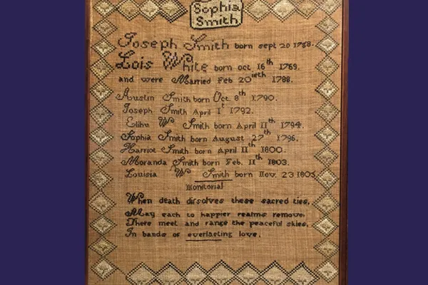 Family register sampler made by Sophia Smith, circa 1806. Photo courtesy of the Hatfield Historical Museum.