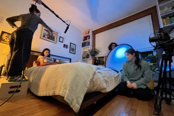 Shira Siegal ’25 (far right) looks on as cast and crew prepare for a scene. Photo courtesy of Shira Siegal.