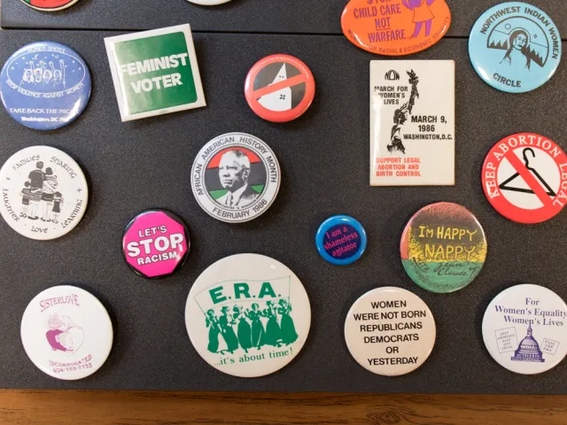 An ERA button is among the items preserved in the Sophia Smith Collection of Women’s History at Smith.