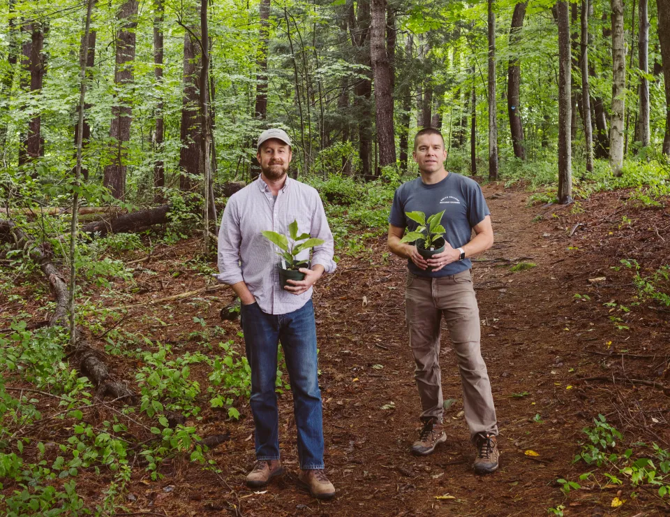 Associate Professor of Biological Sciences Jesse Bellemare, left, and John Berryhill with young magnolia trees at Smith’s MacLeish Field Station in Whately, Massachusetts.