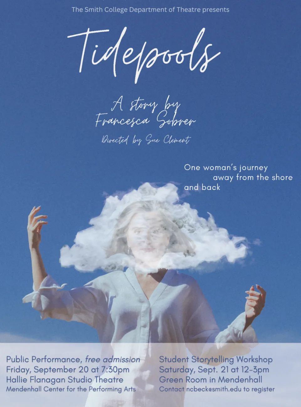 NORTHAMPTON, MA – The Smith College Department of Theatre presents Tidepools, written and performed by Francesca Sobrer ’85, directed by Sue Clement ’79 on Friday, September 20 at 7:30 p.m. in the Hallie Flanagan Studio Theatre. Tidepools is the story of one woman’s journey away from the shore and back. This hour-long performance takes the audience for a ride in the waves with the story of finding and living love only to be caught in an undertow of loss and grief eventually drifting back onto the shore in a tidepool of realized joy. The play is free and open to the public, no reservations required. Francesca Sobrer discovered her talent for storytelling while teaching high school students and learned how powerful they can be. She says, “I’m a big fan of the personal narrative; every time I hear and tell a story, I get a larger understanding of what it is to be human.” Arlene Malinowski, a fellow storyteller in Chicago calls Tidepools “a solo show that is rich in heart and spirit. It’s a love story about being reshaped, reoriented and transformed.”