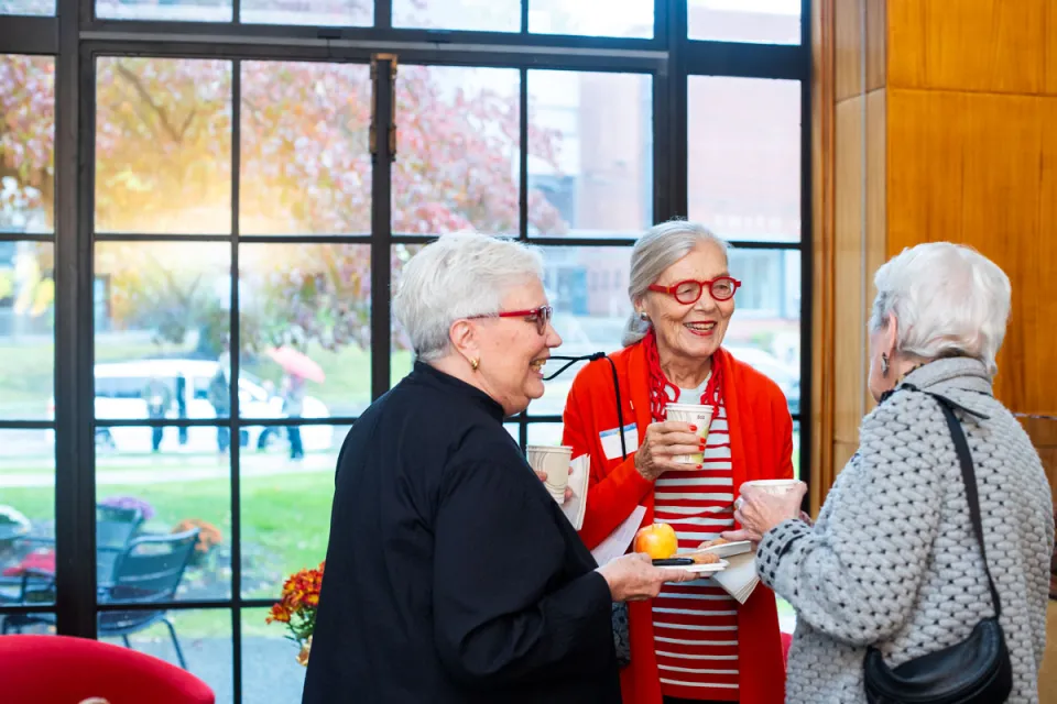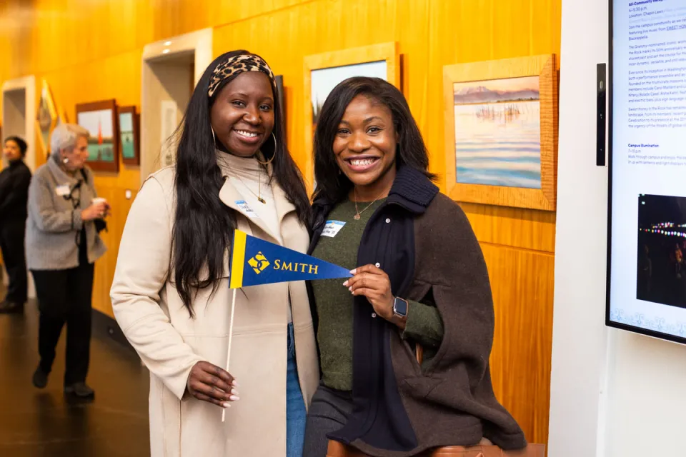 The Alumnae House’s new Welcome Center is earning its name. Alums checking in for inauguration weekend are greeted with an overflowing bowl of local apples, a giant platter of cider doughnuts, all the supplies needed to make a cup of official Smith College tea, and swag-filled tables of Smith-themed buttons and stickers for the taking. Ellen Kearns ’86 has just arrived in Northampton from Pound Ridge, New York. Asked what brings her to Smith on this day, Kearns cheekily says, “Well, guess,” then adds, “I’m here for the inauguration of our 12th president, Sarah Willie-LeBreton, who looks fabulous and full of spirit, so it’s really exciting.” Isa Lentz ’26 is with her mother, Monica Lentz, who flew in from Wauwatosa, Wisconsin. “She was originally going to come for Family Weekend,” Isa says, “but she had a work conflict, so this was the next best thing.” Having had lunch at Chase/Duckett, they’re off to tour the new Neilson, the art museum, the poetry center, and the botanic garden. Friends Elissa Lowell ’95 of Annapolis, Maryland, and Amy Raudenbush ’95 of Somerville, Massachusetts, met at Reunion in 2015 and have been “as thick as thieves” ever since, Raudenbush says. What does inauguration mean to them? “Community,” Lowell says. “Friendship.” Raudenbush adds: “Our 2020 Reunion was online because of the pandemic, so this has been a good opportunity—or excuse—to come back to the college.” —CBJ