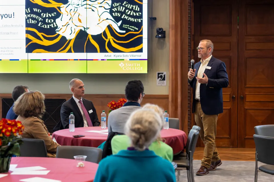 A presentation on Smith’s geothermal energy project is the first event to take place in the Alumnae House Conference Hall since the building reopened following a top-to-bottom renovation. This gives the 40 or so people in attendance “special bragging rights,” says Associate Vice President for Facilities and Operations Jim Gray, the first speaker. Gray gives an overview of the $220 million project, explaining how it will enable the college to reach its goal of carbon neutrality by 2030. Finding himself without a laser pointer when he gets to a slide with a map of the project’s three “districts,” or phases, he grabs an umbrella—“the old-fashioned kind of pointer”—prompting laughter from the audience. Next up is Beth Hooker, the college’s director of sustainability and administrative director of the Center for the Environment, Ecological Design, and Sustainability, who discusses “the fun part”: connecting the project to student learning and research through honors theses, capstone work, and more. Alum audience members, one of whom can be seen knitting throughout the presentation, make the most of the Q&A session, inquiring about everything from the fate of the college’s 80-year-old steam heating system to the expected lifespan of its geothermal successor. —CHRISTINA BARBER-JUST