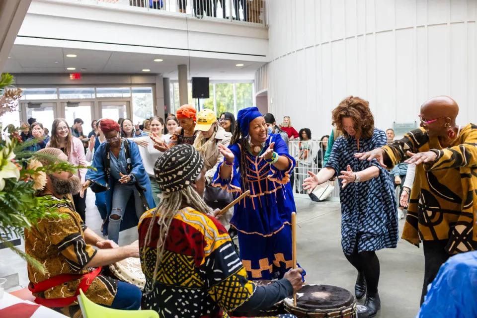 Early in the afternoon, there is the sound of bells—then, from the first floor of the campus center, African drums. Dancers in colorful print dresses and bare feet swoop and sway like graceful birds. The West African drumming ensemble Mbo Lette (“We have a lot to say”) has come to help celebrate inauguration. In minutes, the balconies and stairwells of the campus center are crowded with onlookers. “C’mon down!” the dancers yell up, extending their arms in invitation as the tempo increases. “Dance with us!” Giselle Greenberg ’24 is among those who answer the call. What was it like to move with the group? “It’s so fun,” says the English language and literature major as she rejoins her friends on the sidelines. “It feels so joyful and celebratory.” —BS