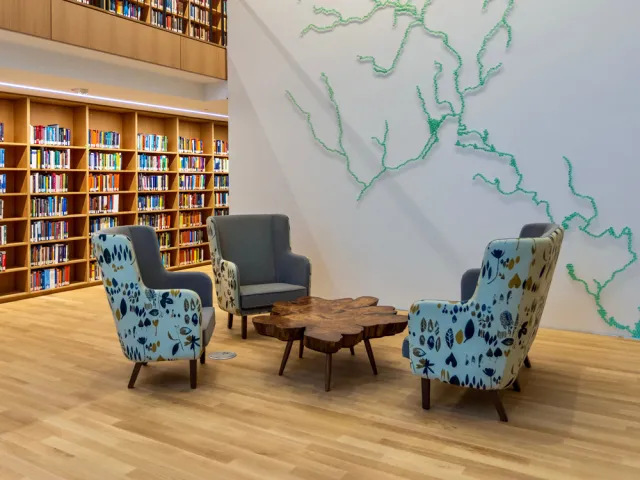 A project truly based in the local community, the reading tables feature metal legs fabricated by Bruce Golinski at Northfield Fab and Machine in Northfield, Massachusetts, and painted at Doug’s Auto Body in Gill. The legs of the benches and coffee tables were hand-turned by Pat Moriarty of the Conway Chair Company in Shelburne Falls, Massachusetts.