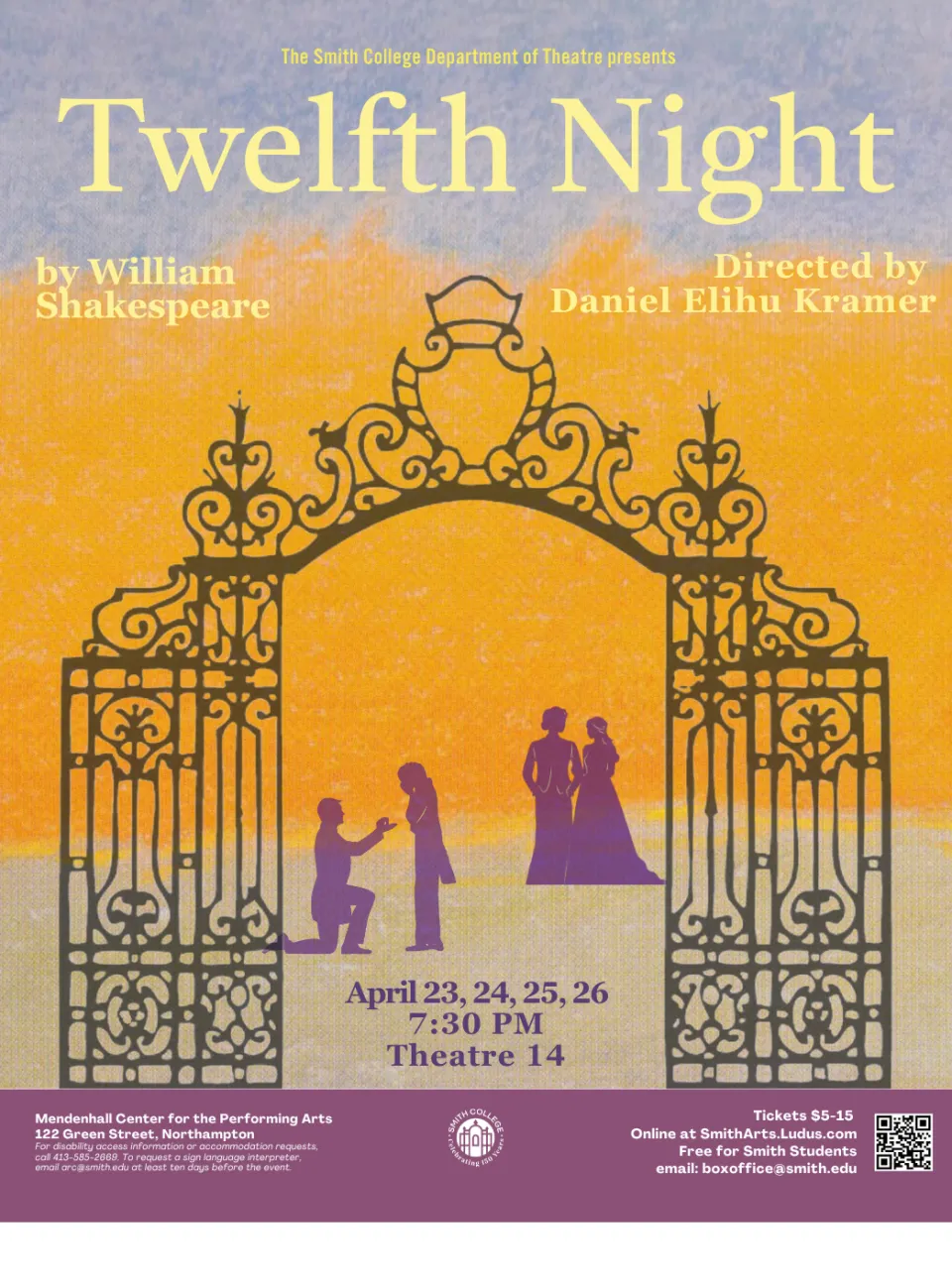 NORTHAMPTON, MA — The Smith College Department of Theatre presents Twelfth Night by William Shakespeare, directed by Daniel Elihu Kramer on April 23, 24, 25, 26 at 7:30 p.m. in Theatre 14. Viola and her twin brother Sebastian wash ashore in Illyria and are separated. Viola dresses as a boy and goes to the court of Count Orsino, who finds himself deeply attracted to this boy, “Cesario.” Sebastian, meanwhile, finds himself with Antonio, a pirate who wants to buy him presents. Orsino sends Viola to court Olivia on his behalf, but Olivia is more attracted to Viola. And all of that is just the beginning. Tickets $5–15 at smitharts.ludus.com. Free for Smith students by contacting the Box Office.