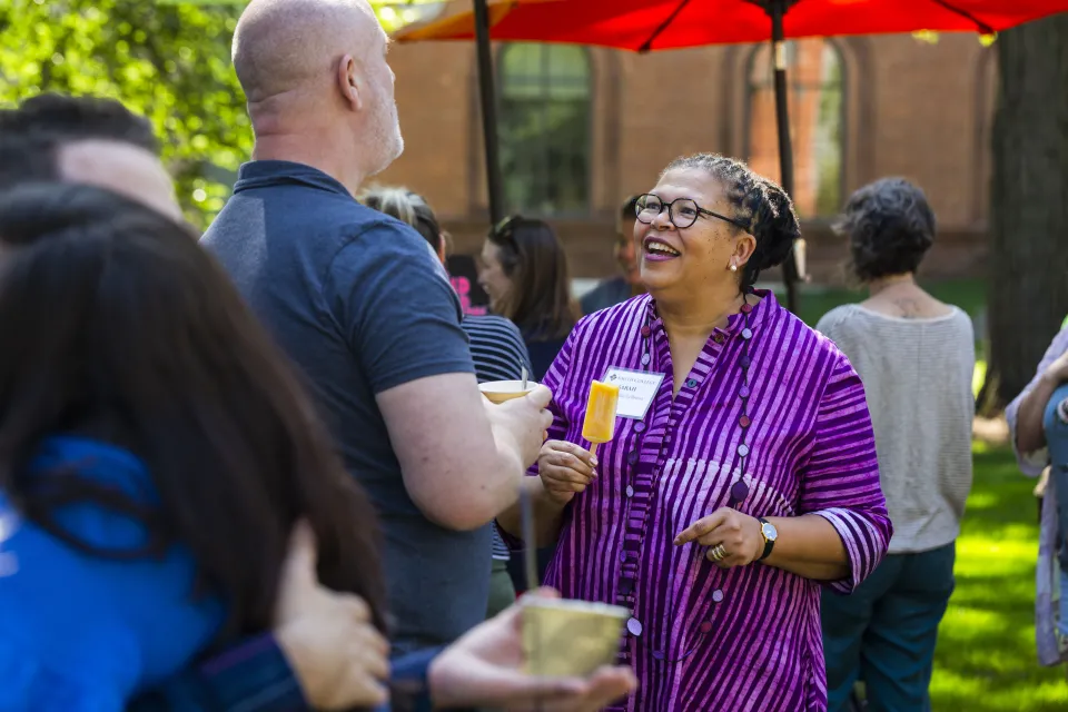 Willie-LeBreton chats with faculty and staff at an ice cream social on Seelye lawn.