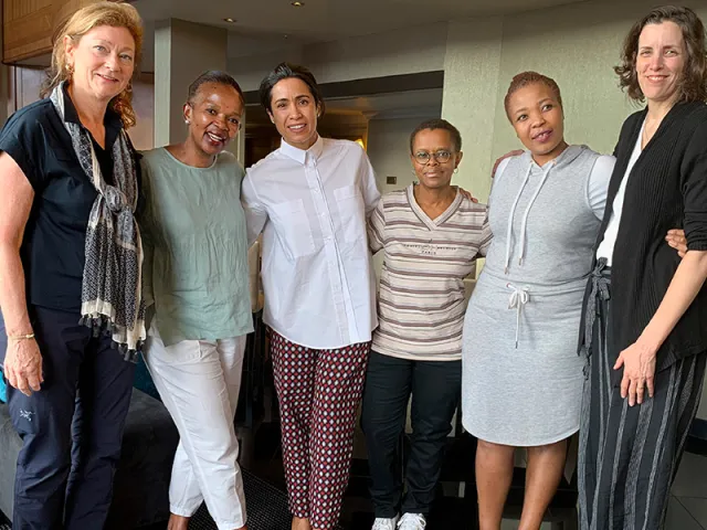 Filming in Johannesburg, South Africa, are, from left, producer Jane Dawson Shang ’82; producer and scholar Tandiwe Njobe ’94; scholars Heather Sonn ’95, Kholeka Mabuya ’96, and Vuyiswa Majova ’97; and director and editor Kate Geis.