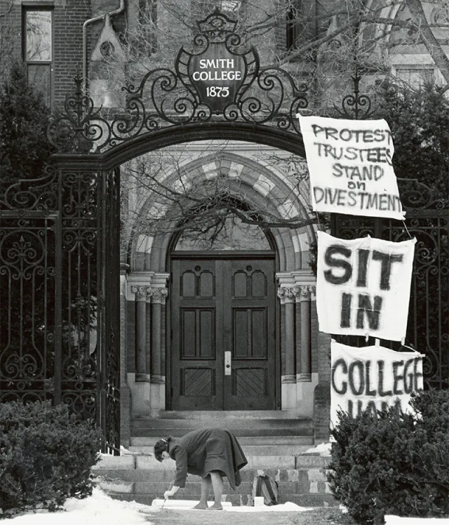 As de Villiers remembers it, Conway had a lot to consider when it came to South Africa. Students and faculty members alike were demanding that Smith divest from companies that did business in the country. Meanwhile, the college’s trustees were wary of taking any actions that would diminish the school’s endowment. As Smith’s first woman president, Conway knew everything she did would be heavily scrutinized, and there were several stakeholders she needed to appease.