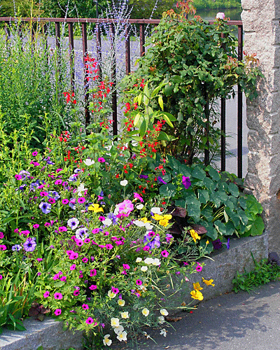 Border cascades into the garden walkway along College