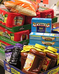 and jelly, spaghetti, canned soup, tuna, cereal, canned beans and rice to receptacles