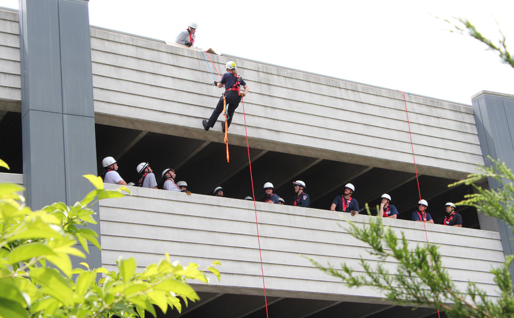 The May 29 training involved team instructors. A larger contingent of team members will return to campus on Wednesday, June 5, for another round of rappel training.