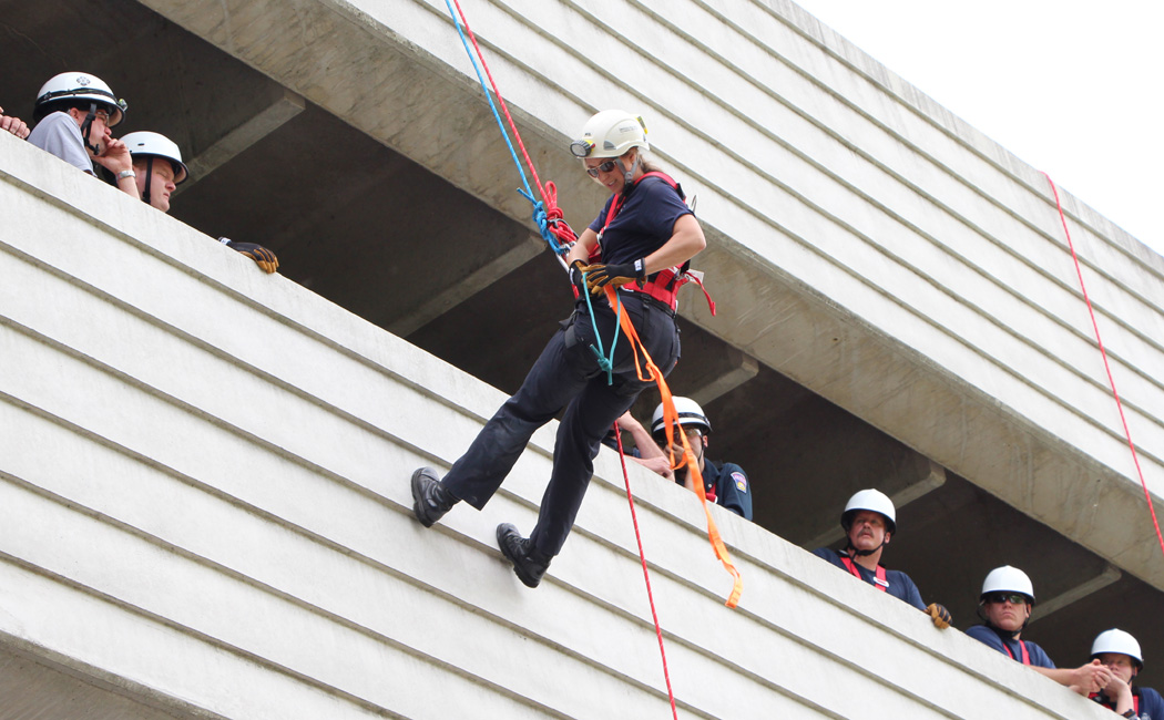 The Smith parking garage on West Street stood in for a new purpose last week when western Massachusetts firefighters rappelled down its exterior walls in a training exercise. The rappel training is part of the preparation of a new unit, the Regional Western Massachusetts Technical Rescue Team, which is composed of firefighters from Hampshire, Franklin, Berkshire and Hampden counties, explained Daryl Springman, a Northampton firefighter and assistant team leader for the local division.