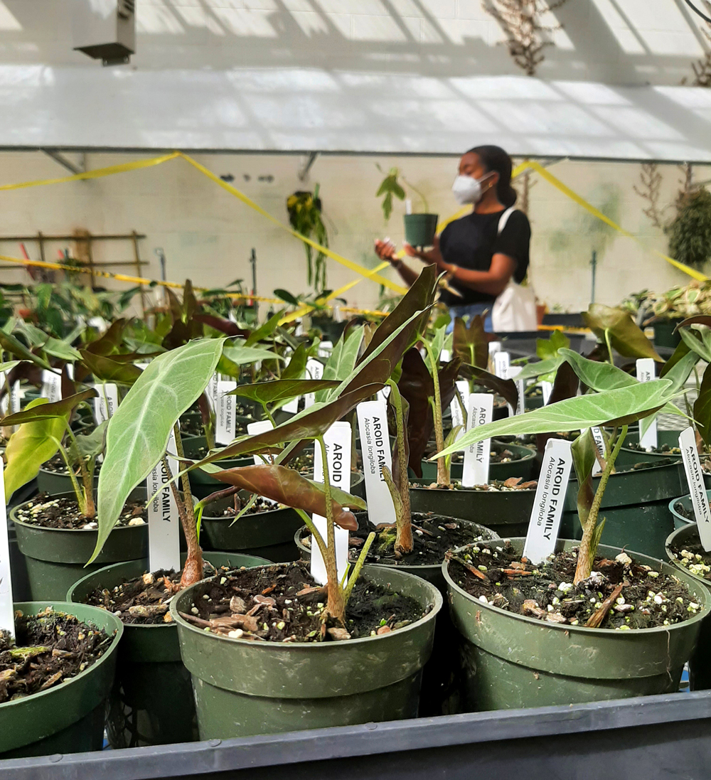 Potted Aroid Family plants wait in a line while a student in the distance considers which to take.