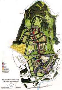 Phase A ("The Commercial Zone")will be the first piece of property to be developed. It is located at the southern edge of the hospital grounds--10.4 acres of land, including the laundry and power plant. The laundry will be saved for use, but the rest of the space will be converted to light industrial development-137,000 square feet of commercial property, and 2 single family homes. |