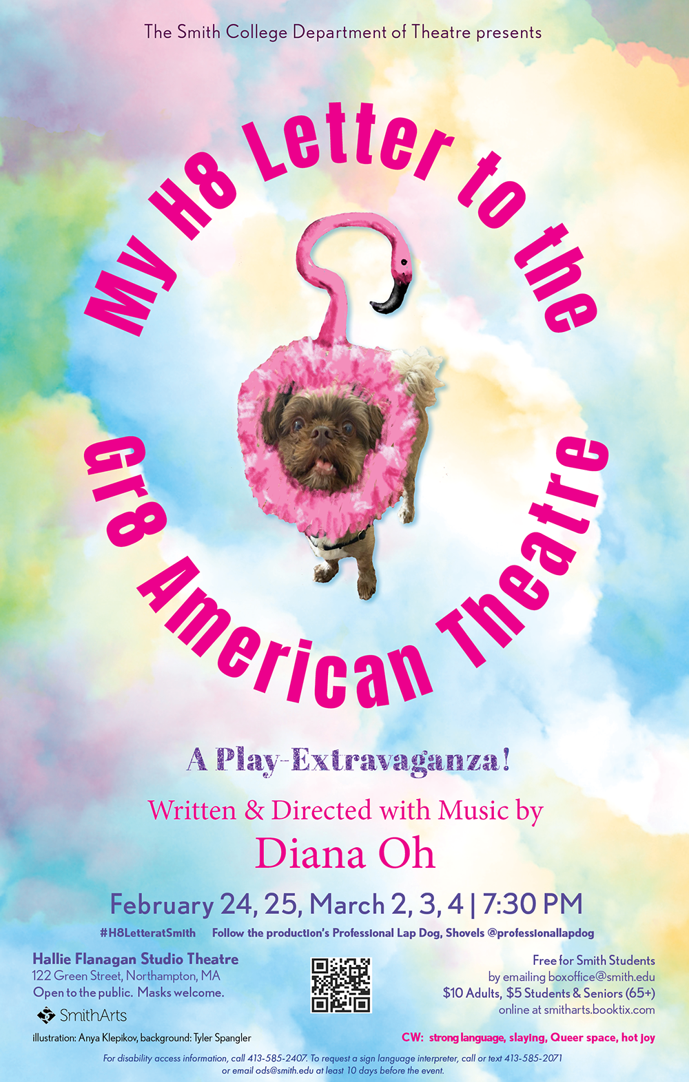 NORTHAMPTON, MA – The Smith College Department of Theatre presents My H8 Letter to the Gr8 American Theatre by Diana Oh ’08 in Hallie Flanagan Studio Theatre on February 24, 25, March 2, 3, 4 at 7:30 p.m. NYC Queer Icon, Contemporary Artist and Musician Diana Oh returns to Smith to direct their new play-extravaganza that satirizes the Great American Theatre—the galas, diversity panels, white leads—using humor, A List of Things, music, and flamingos. My H8 Letter is a call for evolution crossed with a Queer dance club inspired by a kindergarten classroom hiding behind a stage reading. There is a “before” and an “after” My H8 Letter to the Gr8 American Theatre, and liberation is on the other side of it.