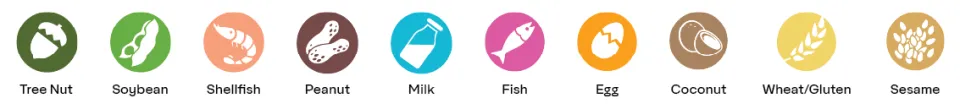 Free of gluten and the top nine most common allergens (wheat, egg, milk, soy, sesame, tree nuts, peanut, shellfish, fish). |