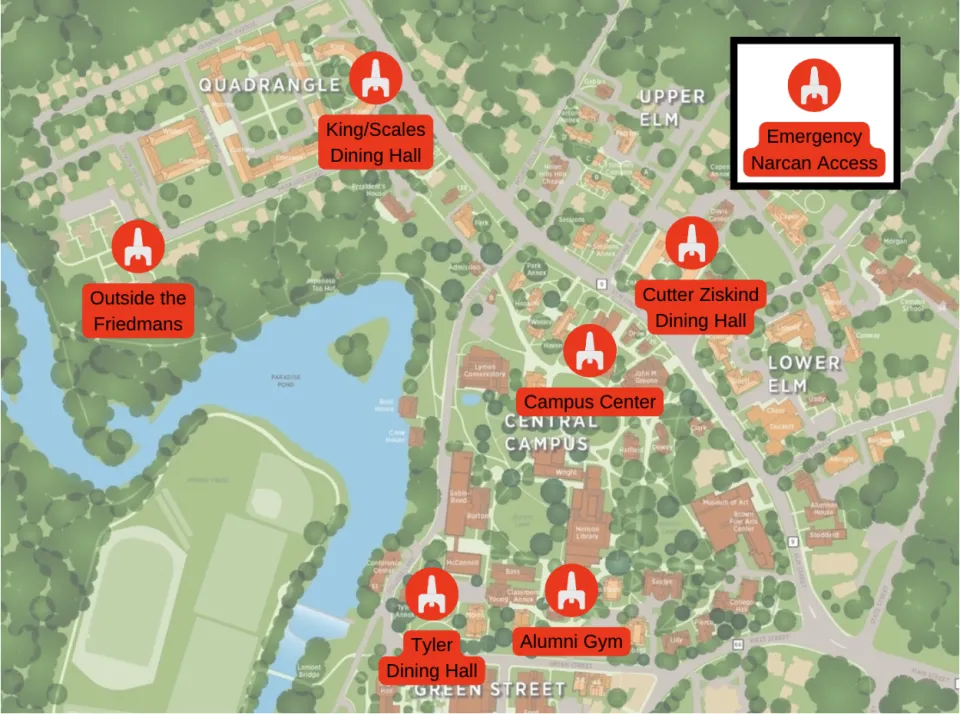 These locations were chosen because of their proximity to student residences. Additionally, students are able to access the dining hall NaloxBoxes 24/7.