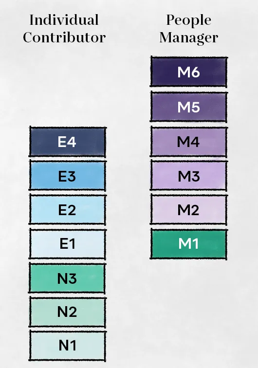 - Four Exempt individual contributor levels: E1, E2, E3, and E4